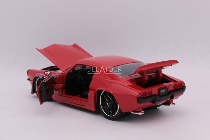 The 1:24 Diecast Modelcar of the Chevrolet Camaro of 1971 in Red with Black Flames.
