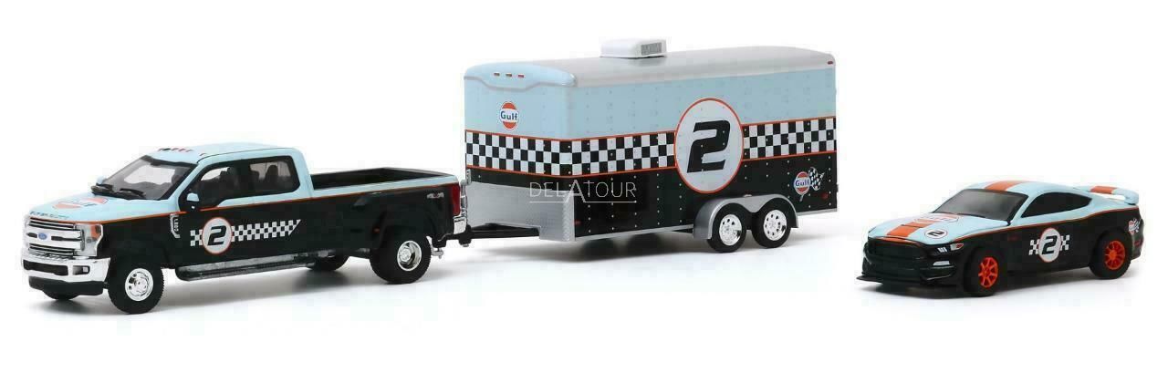 The 1:64 Diecast modelcar of the 2019 Ford F-350 & 2019 Ford Shelby GT350R #2 with Enclosed Car Hauler.