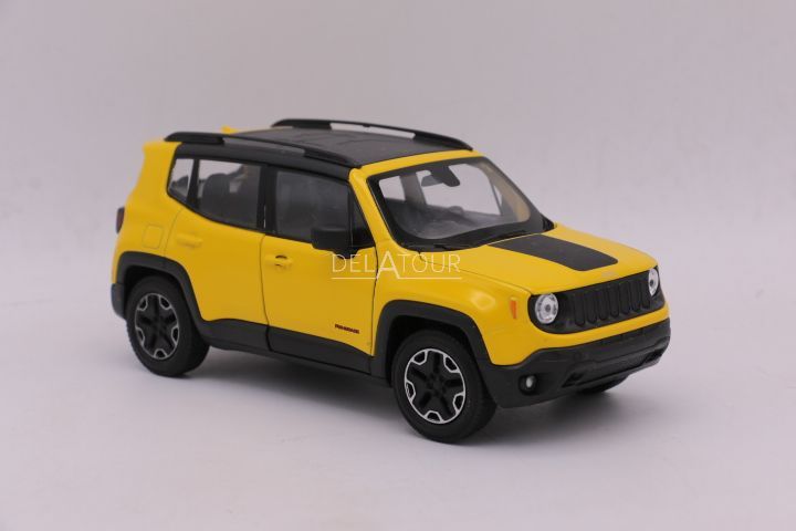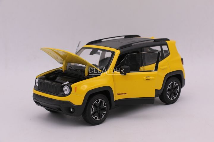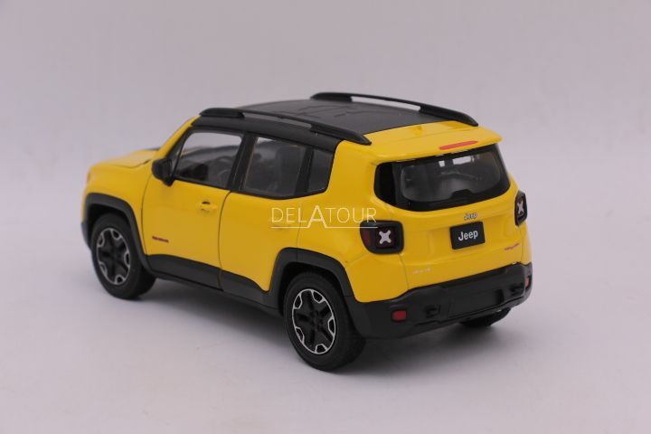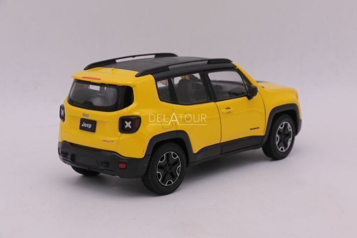 The 1:24 Diecast model of the Jeep Renegade Trailhawk in Yellow.The manufacturer of the scalemodel is Welly Nex.