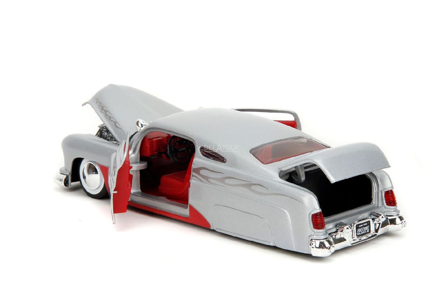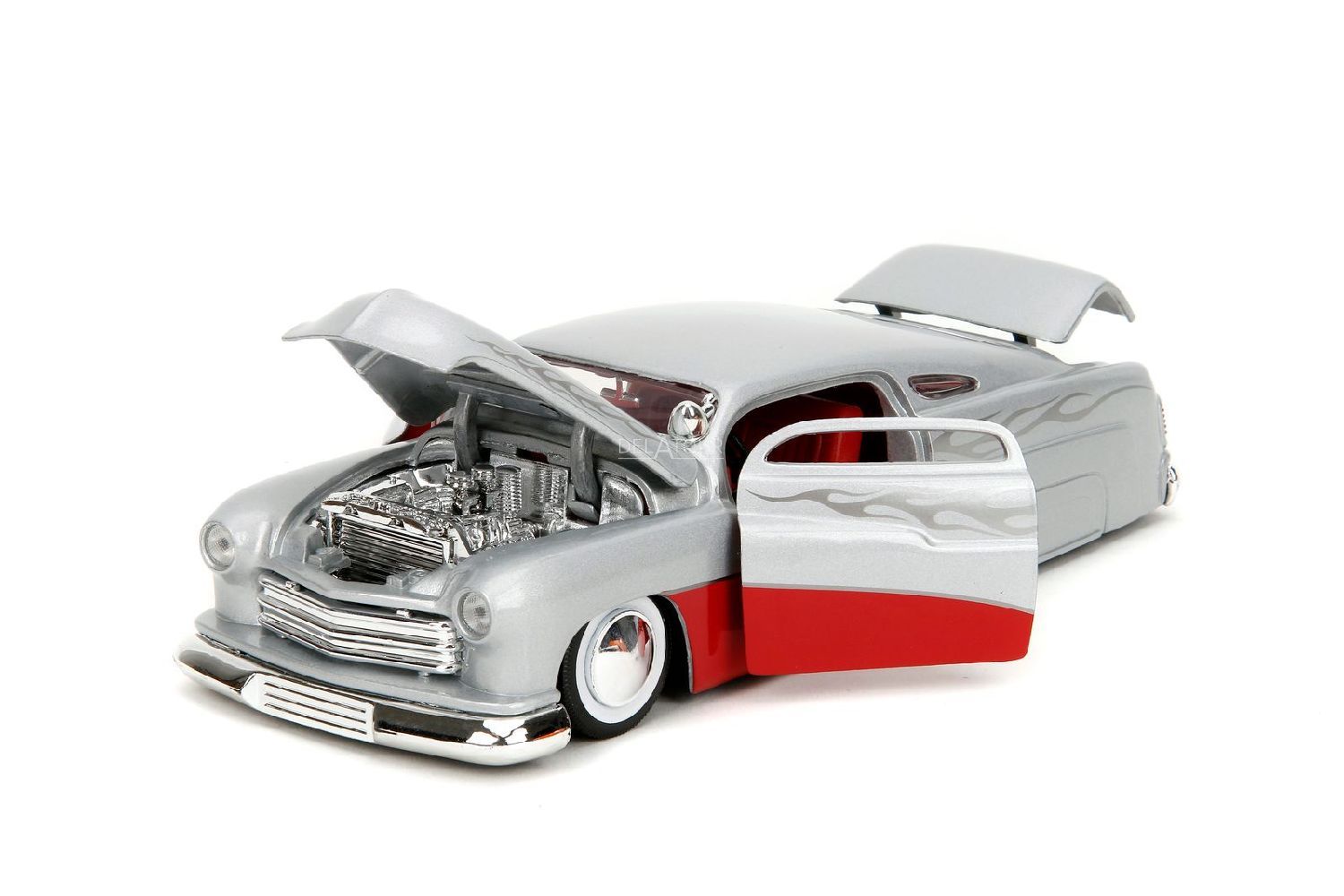 The 1:24 Diecast modelcar of the Mercury of 1951 in Silver and Red.The manufacturer of the scalemodel is Jada.