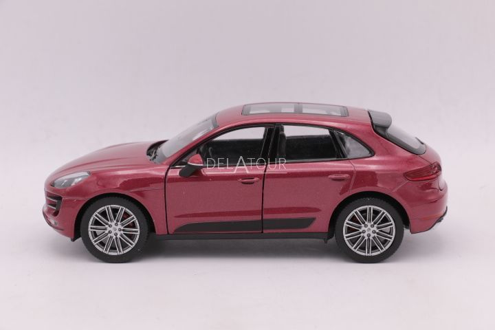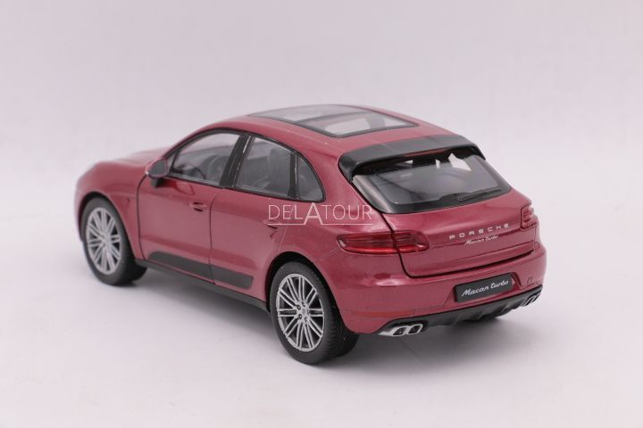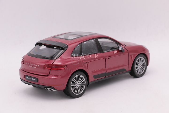 The 1:24 Diecast model of the Porsche Macan Turbo in Metallic Red.The manufacturer of the scalemodel is Welly Nex.