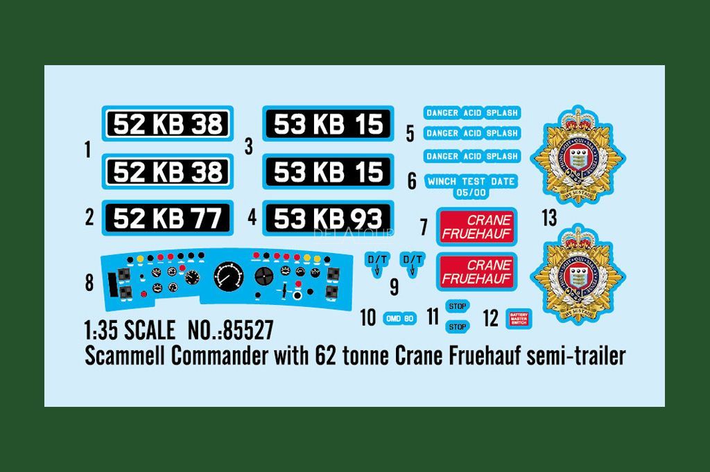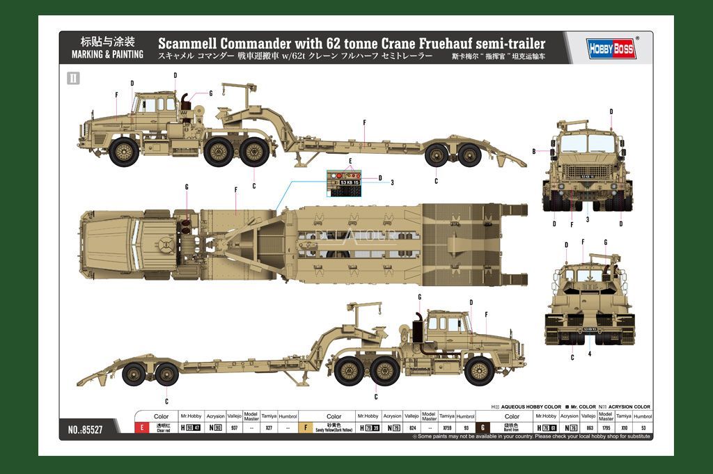 The 1:35 Construction Kit of the Scammell Commander with 62 Tonne Crane Fruehauf Semi Trailer.scale 1/35glue not includeddimension: : 575.4 x 105.4 mm790 plastic partsThe manufacturer of the scalemodel is Hobby Boss.This model is only online available.