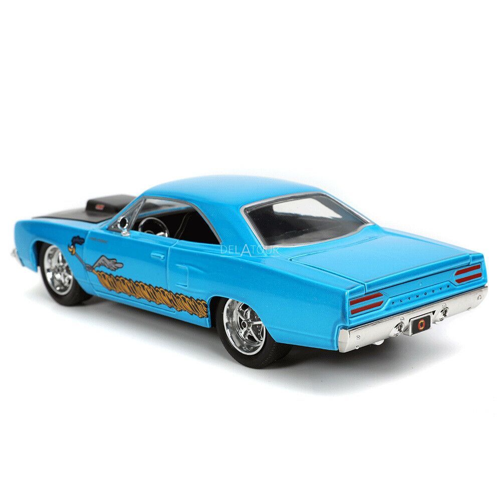 The 1:24 Diecast Modelcar of Plymouth Road Runner & Wile E. Coyote in Blue.The manufacturer of the scalemodel is Jada.