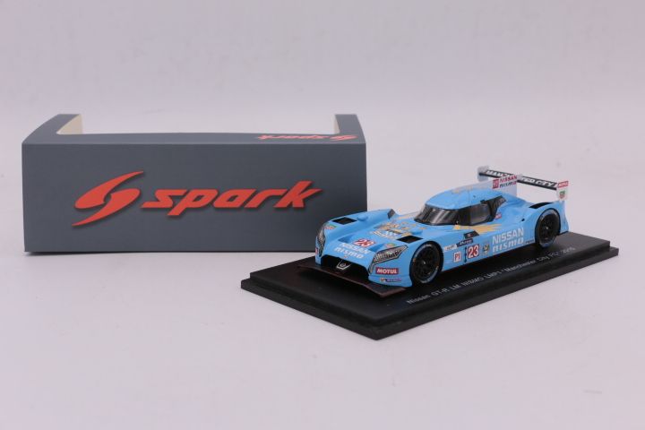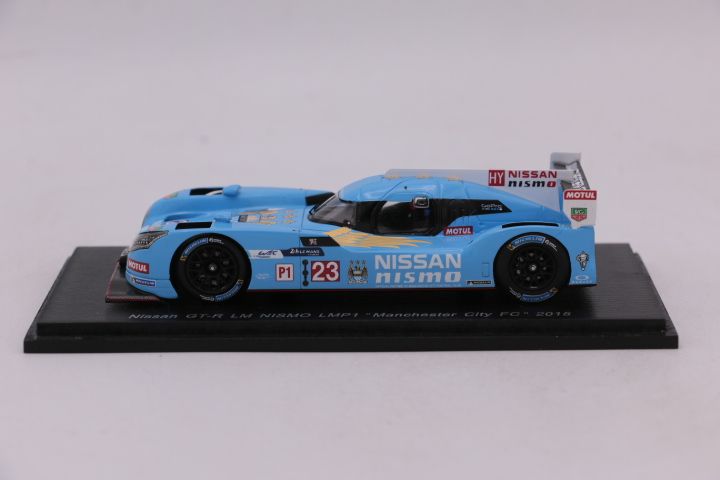 La voiture miniature moulée sous pression à l'échelle 1:43 de la Nissan GT-R LM Nismo LMP1, Manchester City FC de 2015.Le fabricant du modèle réduit est Spark.