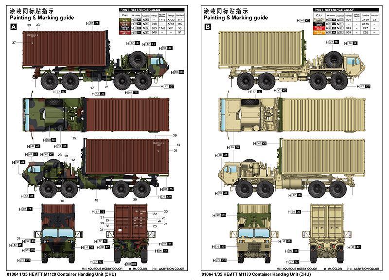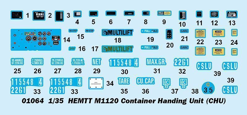 The 1:35 Kit of a M1120 Hemtt Container Handing Unit Chu. Glue Not Included. dimension: 308 × 103 mm 670 plastic parts The manufacturer of the kit is Trumpeter.This kit is only online available