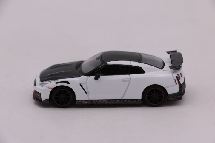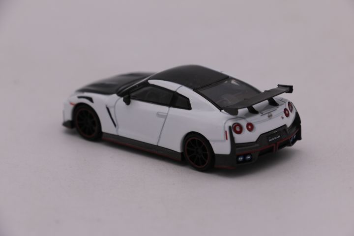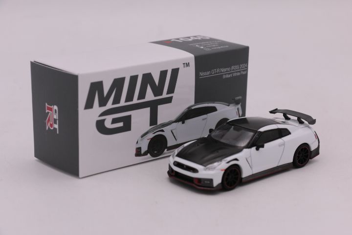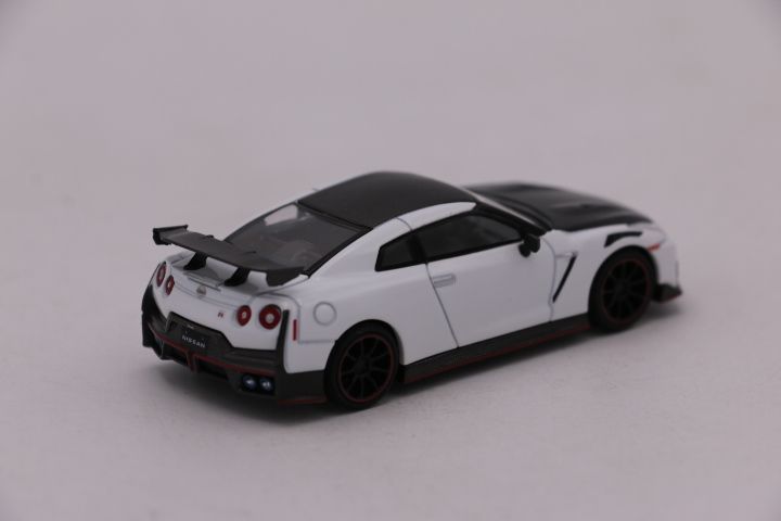 De 1:64 Diecast Modelauto van de Nissan GT-R R35 Nismo uit 2024 in Brilliant White Pearl.De fabrikant van het schaalmodel is Mini GT.