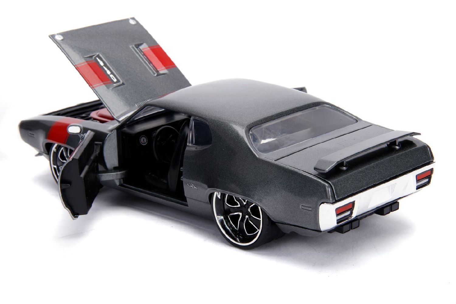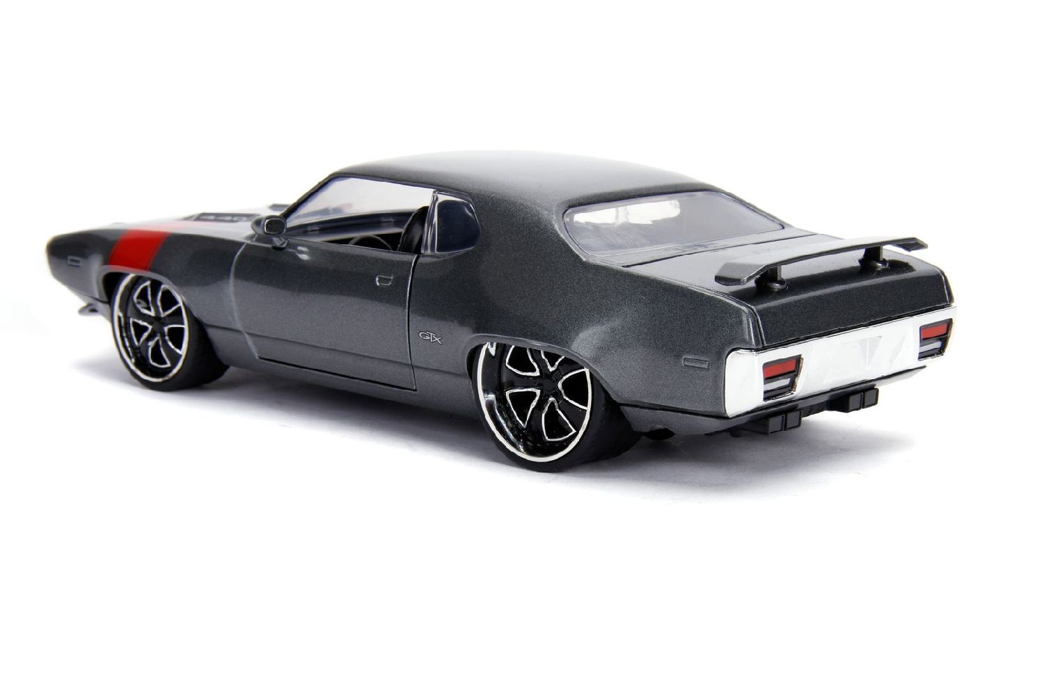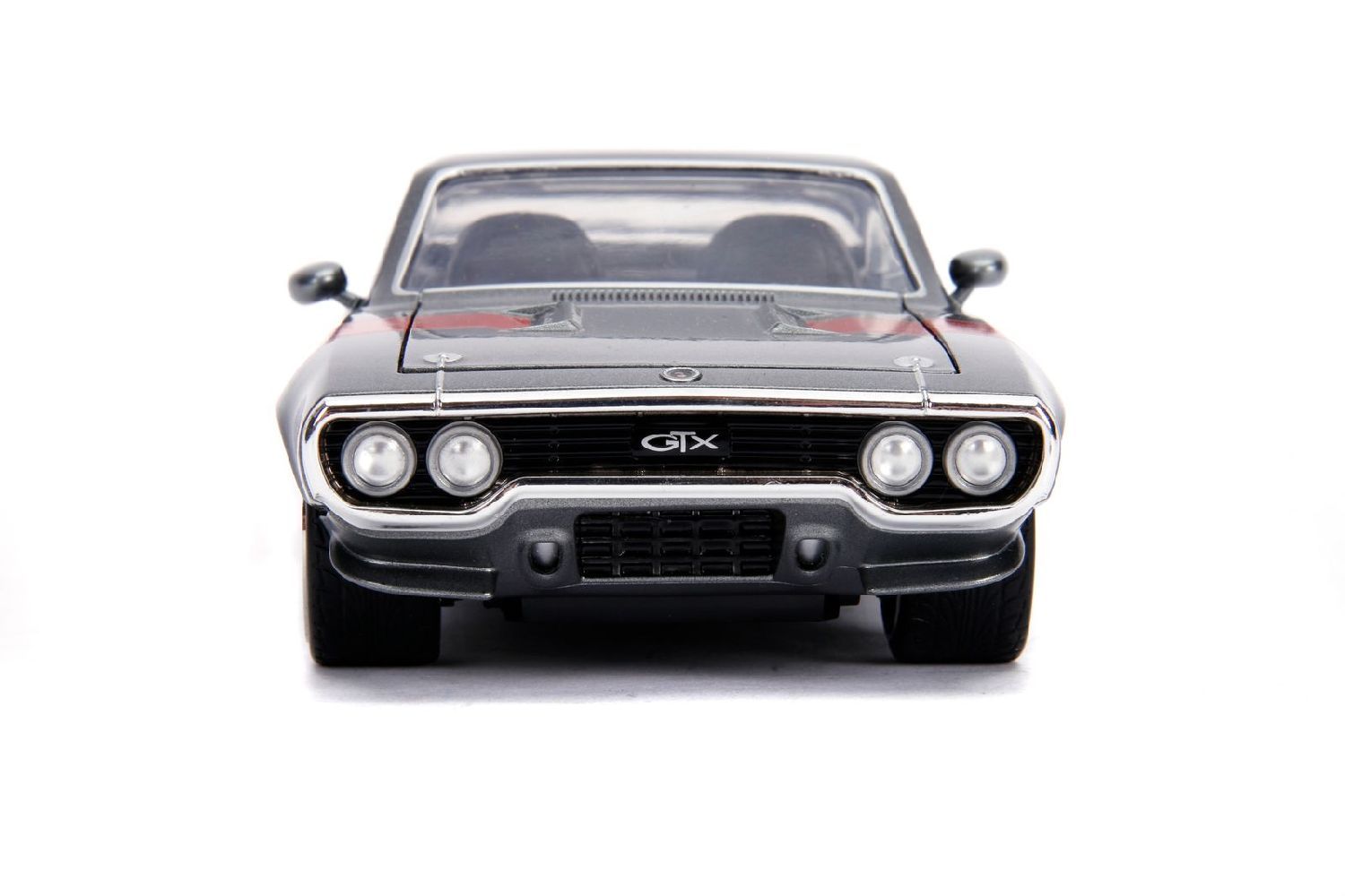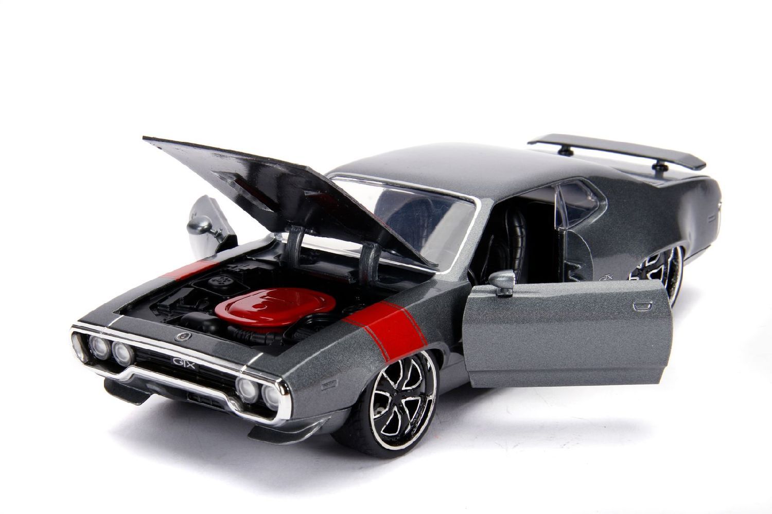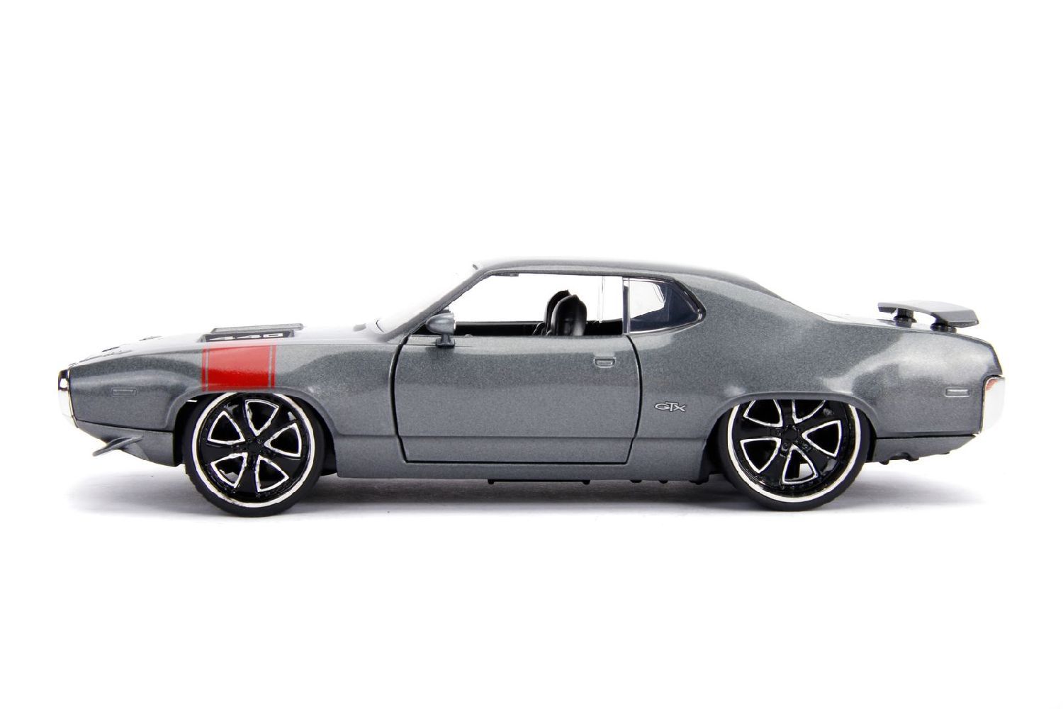 Het Plymouth GTX-model uit 1972 in grijs, schaal 1:24, is gemaakt van gegoten metaal.Het schaalmodel is geproduceerd door Jada.