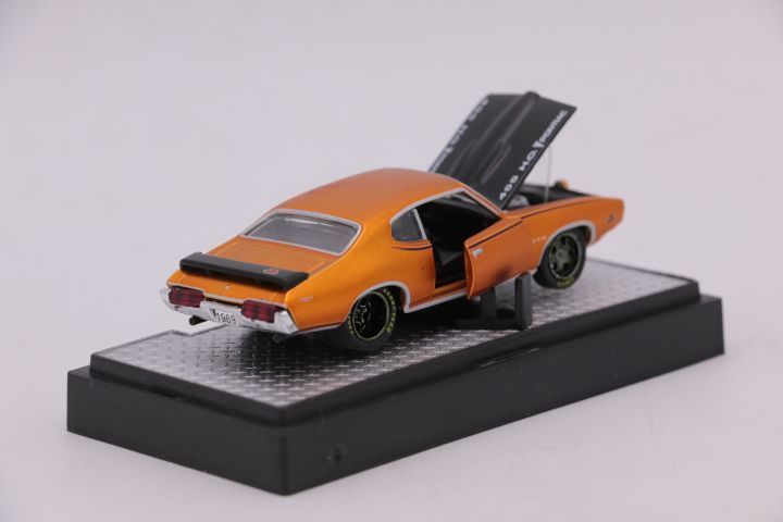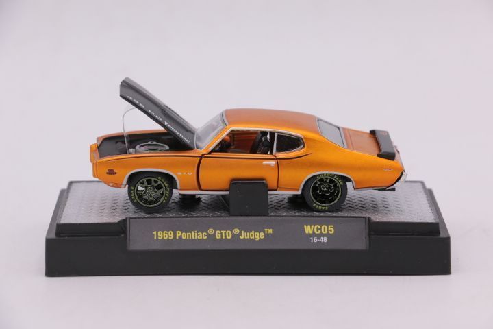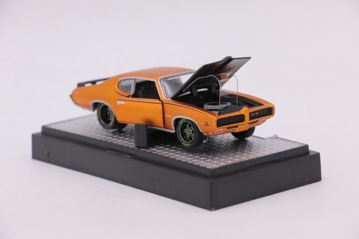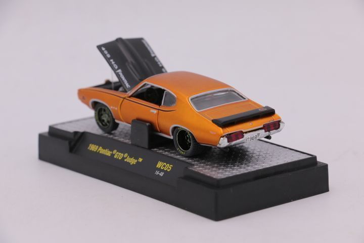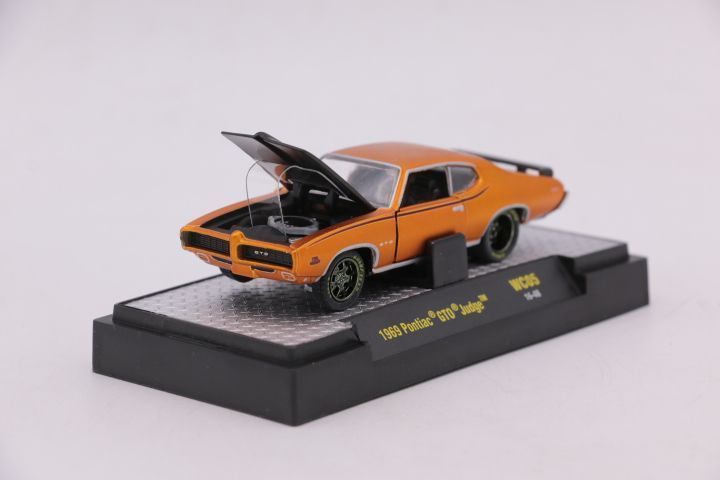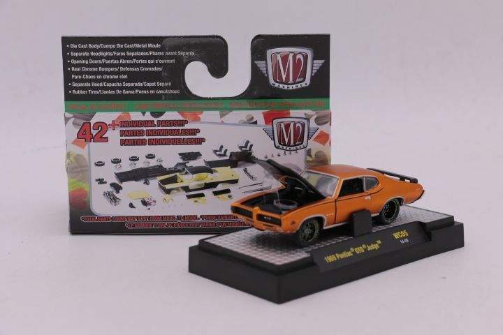 De 1:64 Diecast modelauto van Pontiac GTO Judge van 1969 in Orange. De fabrikant van het schaalmodel is M2 Machines.